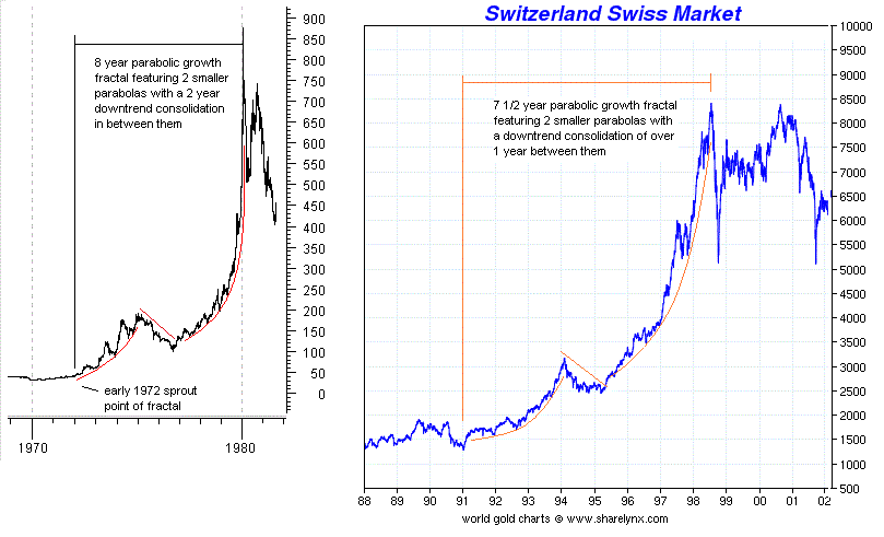 You would have to say yes, it was. It formed yet another twin parabola with the downtrend separator. Note that it was also a non 64 month case being 8 years long. I have shown another of the larger time scale versions alongside it, the runaway Swiss bull which ran 7 1/2 years.