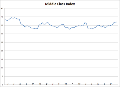 If the above graph is any indication of middle class consumption patterns, then middle income Americans haven’t exactly set the world on fire with their spending. The implication of the M.C.I. is that while middle class spending has certainly increased over the last several years, it has essentially flat-lined on a 3-year basis.While there is admittedly a danger in reading too much into such a simplified overview of middle class spending, it’s likely not far from the truth to assume that middle class Americans aren’t making much progress. At least, that’s how they feel based on the trend of the Middle Class Index.