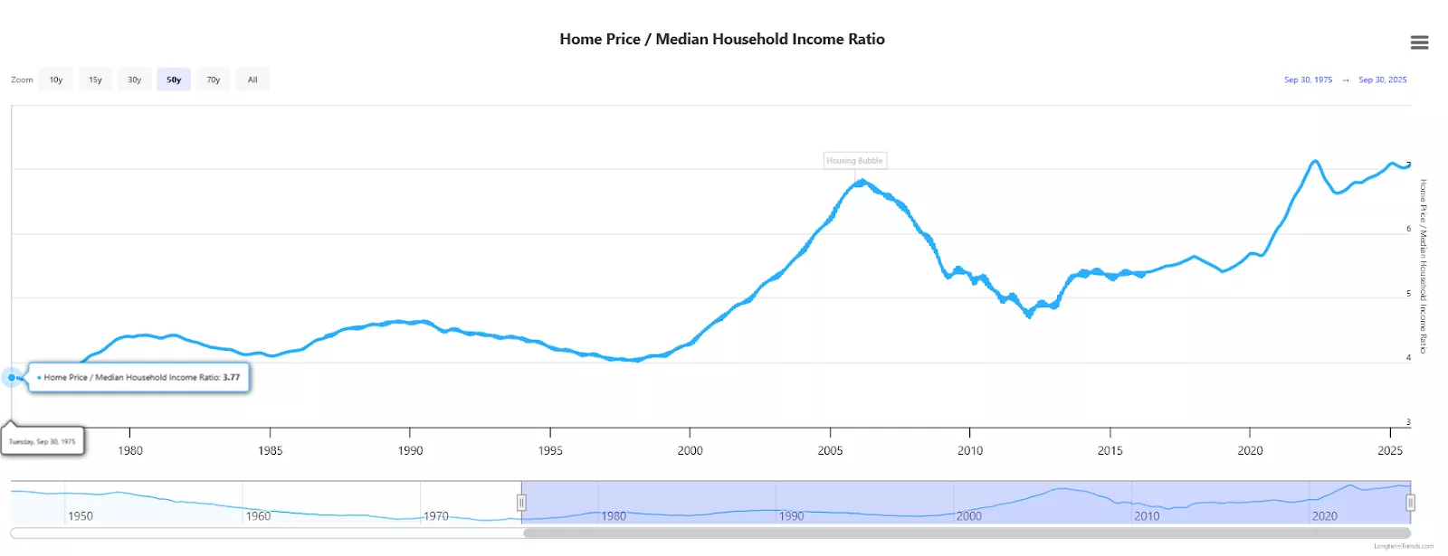 Here is a chart from Longtermtrends.com showing the affordability, or more accurately, the unaffordability of homes. The past 50 years of central bank and government manipulations of markets have caused the home price-to-income ratio to surge from 3.6 to well over 7.0.