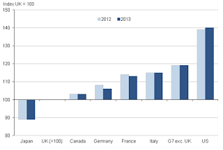 Just as important is output worker. That is a measure of productivity. This is what this lower chart captures: GDP per worker. The UK statistics office produced the charts, and they are understandably from the UK's point of view. The two bars are for 2012 and 2013 respectively. The time series is fairly stable, so one can imagine that the 2014 bar is similar.