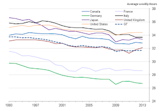 Here are two Great Graphics from the UK's Office of National Statistics. The top chart shows the average hours worked in the G7 countries since the early 1990s. It will surprise many to least that for most of this period, Italy's average work week was longer than the US. Now it is a little below. Japanese workers had the longest work week in 1993. German workers have the shortest work week consistently over the past 20 years followed by France.
