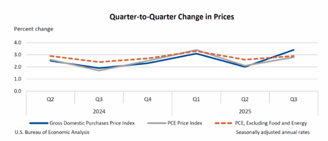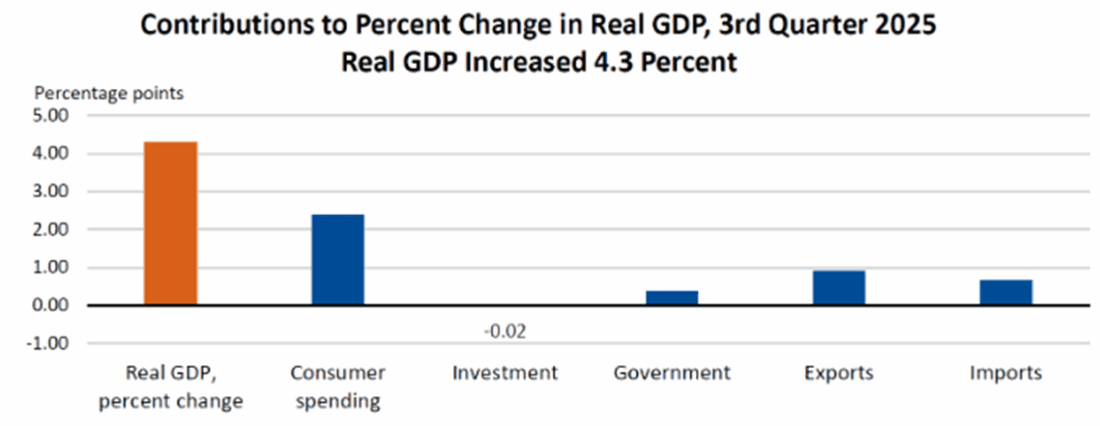 The initial estimate of 4.3% for Q3 Annualized Real GDP was indeed a stunner. It blew past both last quarter’s 3.8% and the consensus estimate of 3.3%. Frankly, I’m at a loss to understand why economists expected that magnitude of a decline, let alone underestimated the positive revision. It appears that it exceeded all but one of the 49 economists’ forecasts in the Bloomberg survey. The Bureau of Economic Analysis (BEA) normally issues three estimates of quarterly GDP, but the government shutdown caused the scheduled October 30th reading to be canceled. Today’s would normally be the second reading for Q3, not the first. Perhaps that affected the quality of the forecasts.