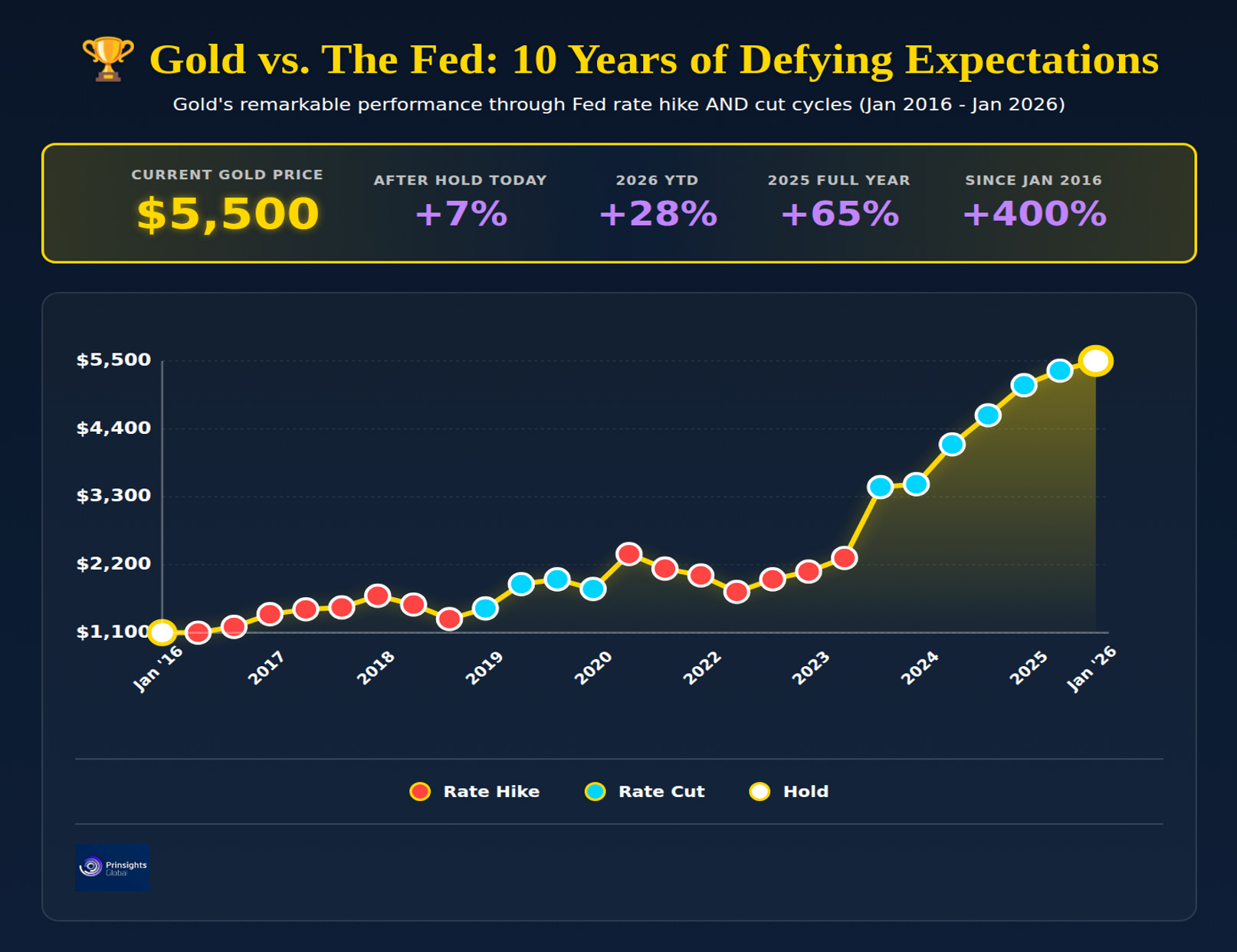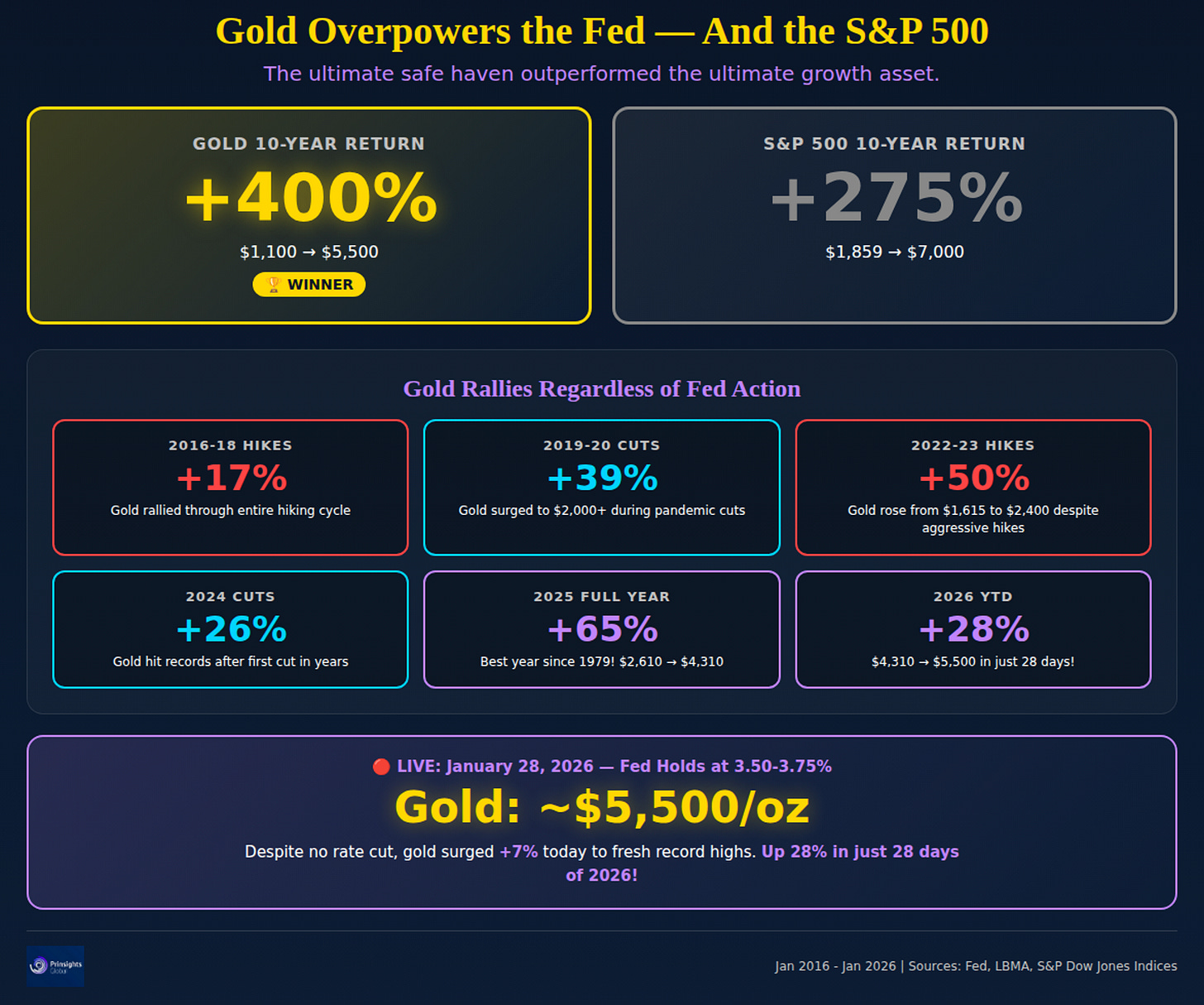 Since January 2016, gold has risen from $1,100 to $5,500. That’s a more than 400% in return through 15 rate hikes, 10 rate cuts, 53 holds, a pandemic, an inflation spike, 2 wars, and a Fed that’s been often stuck feigning power over inflation and uncertainty.