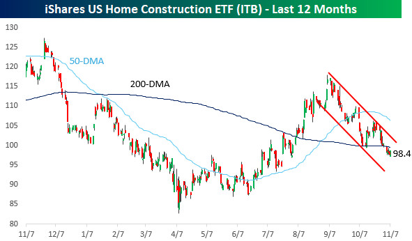 Normally, on a day when the S&P 500 rallies more than 1%, you would expect to see most stocks trading higher along with it, but if there’s one group that seems to lag the market every day lately, it’s the homebuilders. Right on cue, the group’s performance today trails the overall market so much so that the iShares Home Construction ETF (ITB) is down on the day, just like it’s down on the year as well.