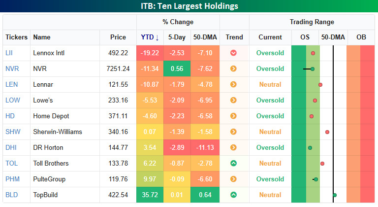Looking at the performance of the ten largest holdings in ITB, YTD returns have been mixed. As its name suggests, ITB is a home construction ETF, so it’s not just made up of homebuilder stocks. Of the top ten holdings, only five stocks would be considered pure-play homebuilders, and only two of them – NVR and Lennar (LEN) - are down YTD. The worst performing stock of the group has been Lennox International (LII) with a decline of close to 20% YTD, while TopBuild (BLD), another non-homebuilder company, has rallied over 35%. It’s also the only stock listed that has managed to outperform the S&P 500.