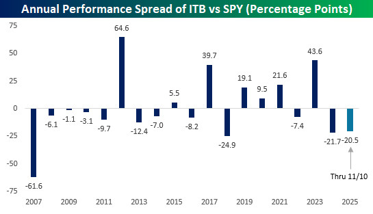 It’s been a bad year for homebuilders, but the underperformance versus the market isn’t anything new. The year’s not over yet, but last year, ITB underperformed SPY by an even larger amount than it has YTD. In 2018, ITB underperformed by close to 25 percentage points, and back in 2007, the performance spread was over 60 percentage points in favor of the S&P 500.
