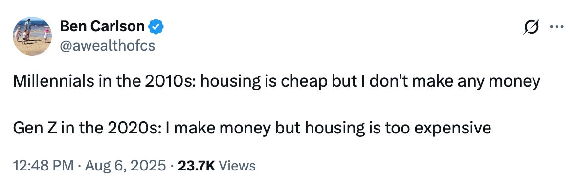 Conor Sen has talked about this idea a lot, pointing out that consumption is contributing far less to GDP growth now than it was in the late 1990s. Nick Magguilli wrote about the idea recently too. He essentially says that people (who would normally buy a house) are throwing money into financial assets because housing is just too expensive.