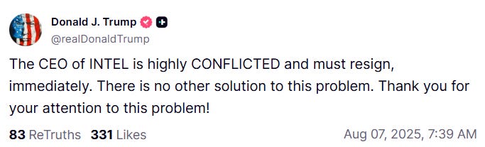 And Trump has now decided to tariff semiconductor imports at 100%, exempting companies that move production back to the US (the trick here is to simply announce that you’re moving production to the US). TSMC is exempted. Apple3 is exempted (Tim Cook gave Trump a 24-karat gold engraved trophy and promised to invest $600 billion in the US4). The Intel CEO was not so lucky.