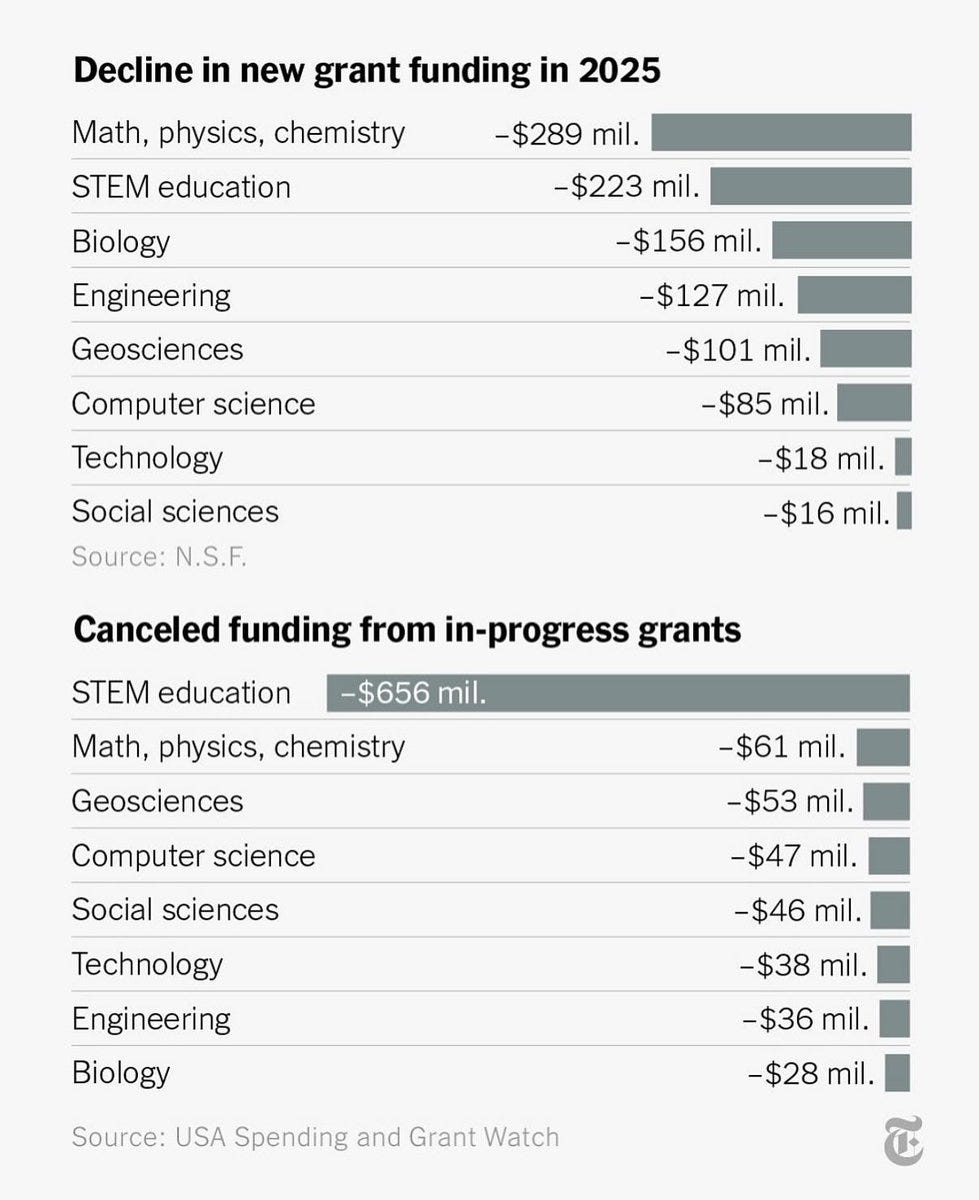 Science funding has been cut by 50% in the US. We were once the gold standard for important research and now that China is closing in, the administration has responded by gutting the National Institute of Health and the National Science Foundation.