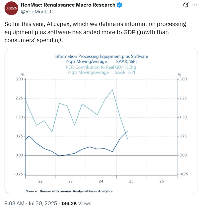 And companies like Meta are essentially acting as a technological and financial arm of the government, fueling fiscal expansion, as Jason Furman described. Someone has to prop up the faltering US economy which is starting to buckle under slowing growth and tariff uncertainty. So we get data centers (which contribute $26 in taxes for every $1 in services they take)1. But who is all of this really for, you know?