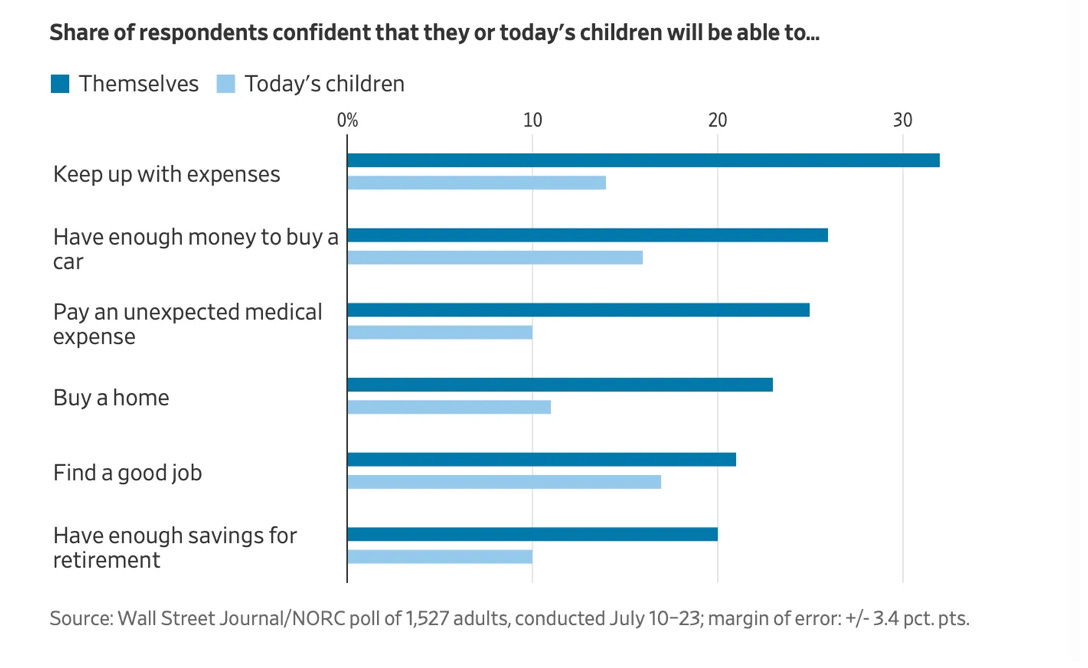 A lot of young people are very worried. The WSJ put it neatly: The Economy That’s Great for Parents, Lousy for Their Grown-Up Kids, highlighting how a generation that came of age during zero rates and rising asset prices is now facing a ladder that’s missing several rungs. Young people - and their parents - don’t believe that upward mobility will be there for them.