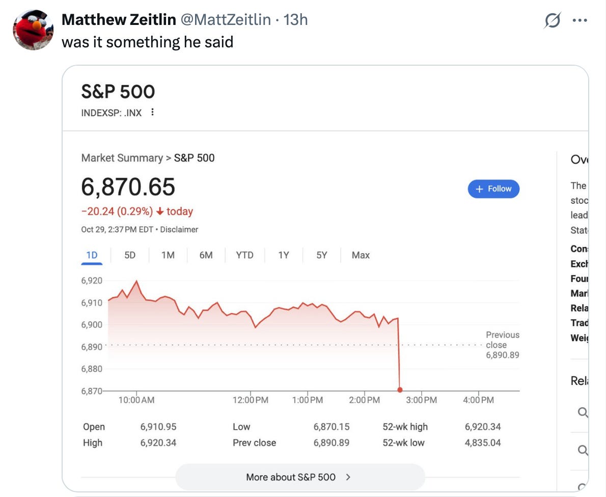 Powell also warned that another 25bps cut might not happen this year. The government shutdown means the Fed is flying blind - they don’t have the data they need. The shutdown has cost $18 billion so far (if anyone’s counting). Inflation isn’t totally fixed (2% is the goal, not 3%) but the labor market is increasingly wobbly, especially now thanks to sweeping job cuts that might be due to a correction from overhiring during the pandemic… or automation.