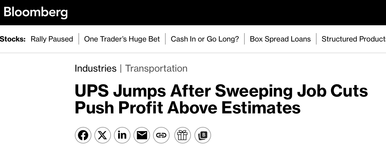 UPS got a huge thumbs-up from the market for cutting 34,000 jobs (and outsourcing jobs to USPS?), a focus on efficiency instead of expansion. Why build or invent when you can just optimize?