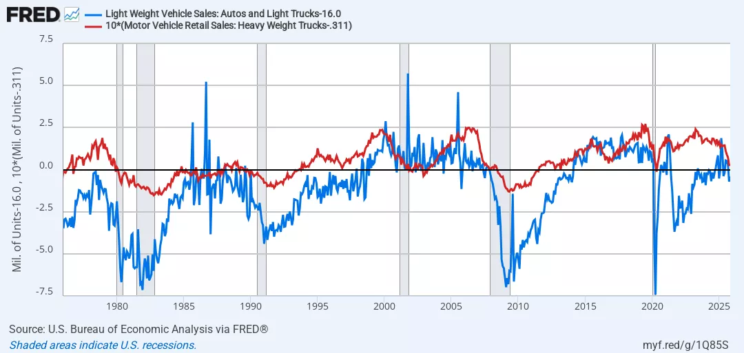 Further, while the 3 month average trajectory since March has been declining, at their current levels car and light truck sales are at higher levels than at any time from 2022 through late 2024. So while truck sales are very recessionary, car sales are not recessionary at all.