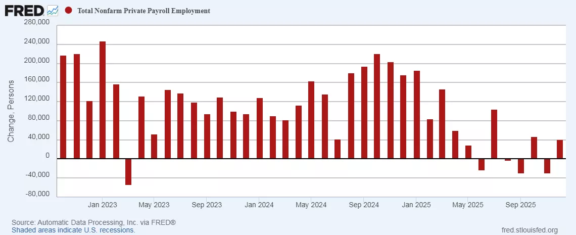 To cut to the chase, ADP reported at 41,000 gain in private jobs in December. As shown in the graph linked to below, according to this series since July only 27,000 jobs have been added to the economy in total, or an average of 5,400 each month(!):
