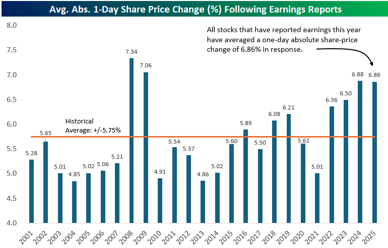 The average stock that has reported earnings this week (more than 600 companies) has seen a one-day share price reaction of more than +/-8.5% (absolute change). That's much higher than the 20+ year average absolute move of 5.75% that US-traded stocks have historically experienced on their earnings reaction days. (What this means is that in modern markets, the average stock can expect to see a one-day move of +/-5.75% once per quarter following its earnings release. Yes, a large portion of a stock's move over its lifetime comes from the one trading day each quarter after it reports earnings.)
