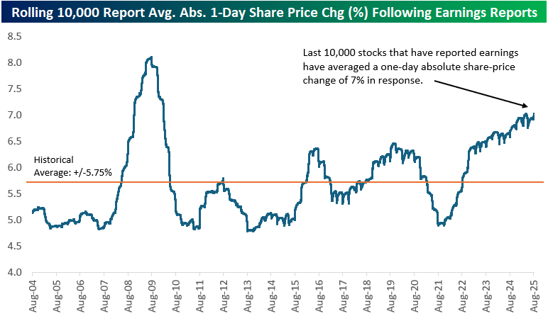 Another way to chart long-term earnings-day volatility is to look at the rolling 10,000-earnings report average one-day move for US stocks that have reported since 2001. Each point on the blue line in the chart below shows the average one-day change on earnings that the prior 10,000 stocks reporting have experienced.