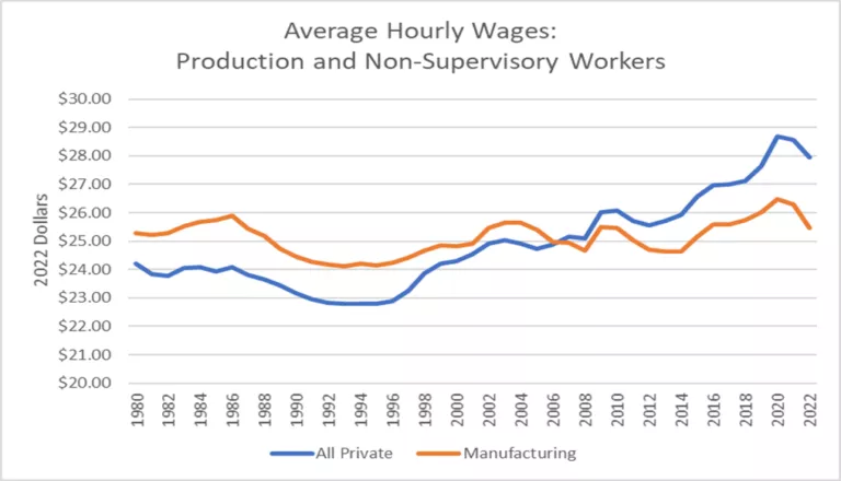As can be seen, the average hourly wage in manufacturing used to be higher than the average wage in the private sector as a whole. In 1980, it was 4.1 percent higher. They crossed in 2006 and have continued to diverge in the years since. The average hourly wage for production and non-supervisory workers in manufacturing is now 8.9 percent less than the average for the private sector as a whole.