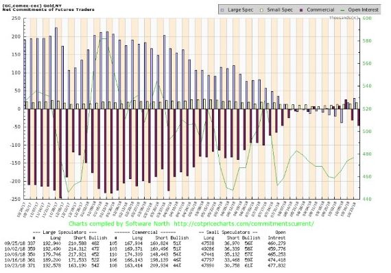 This chart is courtesy COT@softwarenorth.com, and it shows commercial gold traders are ‘net short’ by just 47,000 contracts. As a percentage of open interest the number is bullish at 10%.