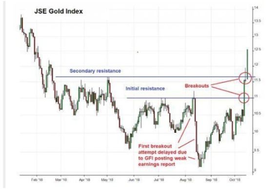 This chart courtesy Dollarcollapse.com, and it shows an upside breakout by the JSE gold miners index.
