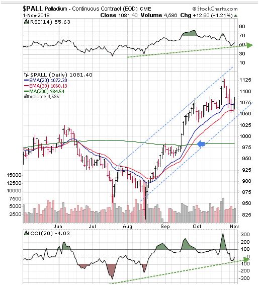 Featured is the Palladium chart. Price often leads gold and silver to the upside. The breakout above the 200 day moving average at the blue arrow has been confirmed and is ongoing. The moving averages are in positive alignment and rising.