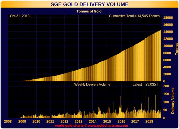 This chart is courtesy Goldchartsrus.com. and it shows the amount of gold that is delivered to the Shanghai Gold Exchange each week. This is in addition to the gold that comes in via Hong Kong.
