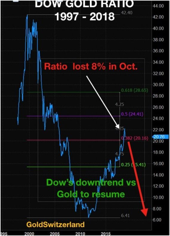 This chart is also courtesy Goldswitzerland.com. It shows the likelihood that the Dow-Gold ratio will turn down. In 1980 the value of 1 ounce of gold was equal to the value of the value of the Dow. Today it takes 20 ounces. Selling Dow stocks and buying gold is beginning to look attractive.