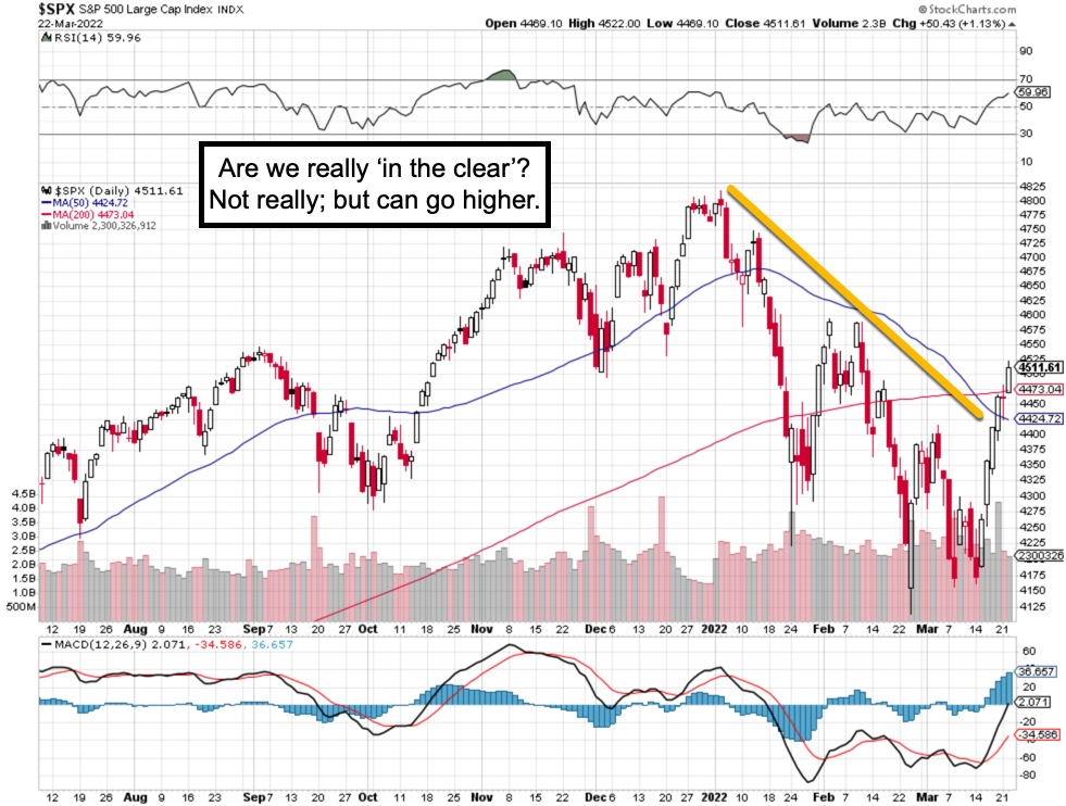 So religiously tightening rates and then draining the Fed Balance Sheet in the midst of a war, historically doesn't workout very well. So I can't disagree with the sentiments of 'not fighting the Fed', even as I properly called this recent S&P reversal from down-to-up. Certainly some analysts are understandably relieved at this, but my nature, as having caught the recent lows, is to be 'less' optimistic as S&P works higher. But the skeptics last week are still skeptics so to the extent that means anything, we probably see stocks grind a bit higher.