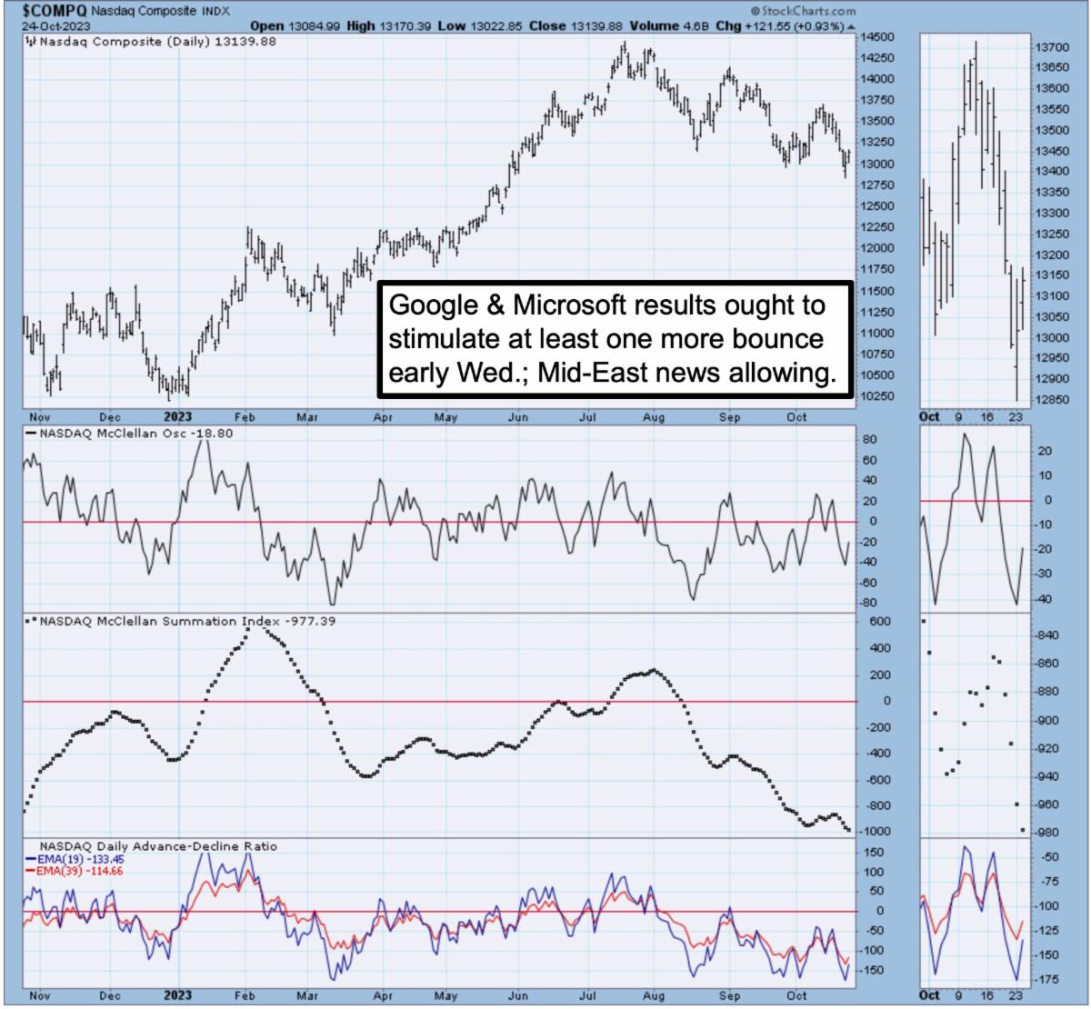 Today's market did gain some traction, and probably will persist Wednesday, but I'd not get excited. Again we tended to advocate nibbling in purges, not in the surges, and that approach is maintained for now. It's not merely a wartime strategy or anything complex, it's just combinations of seasonal low prospects and caution about chasing anything when you don't know what lurks around a corner as far as attacks on American facilities or Israel. And there's worrisome levels of antisemitism, that normally is limited to truly ignorant people, except for what's going on with colleges. Increased war triggering hostility vs. what is going to be needed: resilience and perseverance to prevail over barbarism, to somehow derail a Muslim 'reconquista' (to borrow a term from ancient Spain).