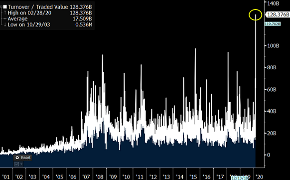 "History was made today [Friday] as SPY became the first security to ever trade over [$128b] in a day. An absurd amount of activity that speaks to the deep level of fear in the market and gravity of situation. (for context AAPL's [average] daily volume is like $6b). Also, ETFs as a whole traded $414b, 4x their [average], blows away old record. They also accounted for 43% of all equity trading volume today, normally it's about 25%."