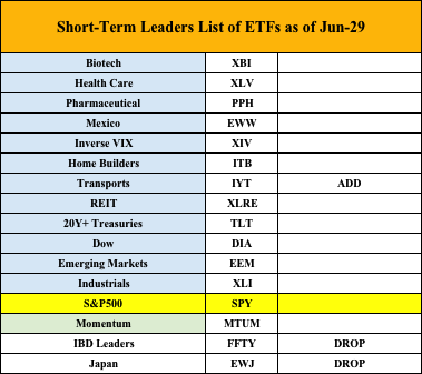 Transports were added to the leader list today, and the IBD Small Cap Leaders and Japan were dropped. The Financials, XLF, is very close to being added as a leader.