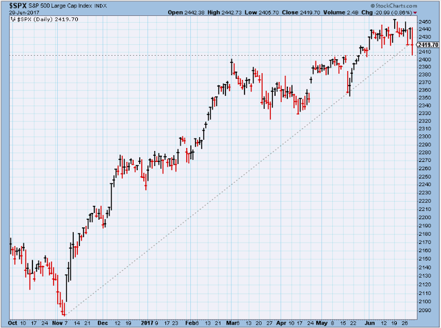 This chart shows the SPX breaking the trend line, but holding the support level. When the SPX breaks down in this chart, then we have the possibility of a broader decline. So the bears have a little work to do.