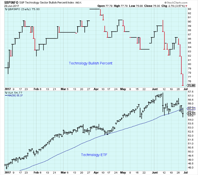 This is a good chart. The Tech index has broken the 50-day, and the bullish percent is confirming the decline. I am sure I am not the only one looking at this as a potential buying opportunity in the weeks ahead.