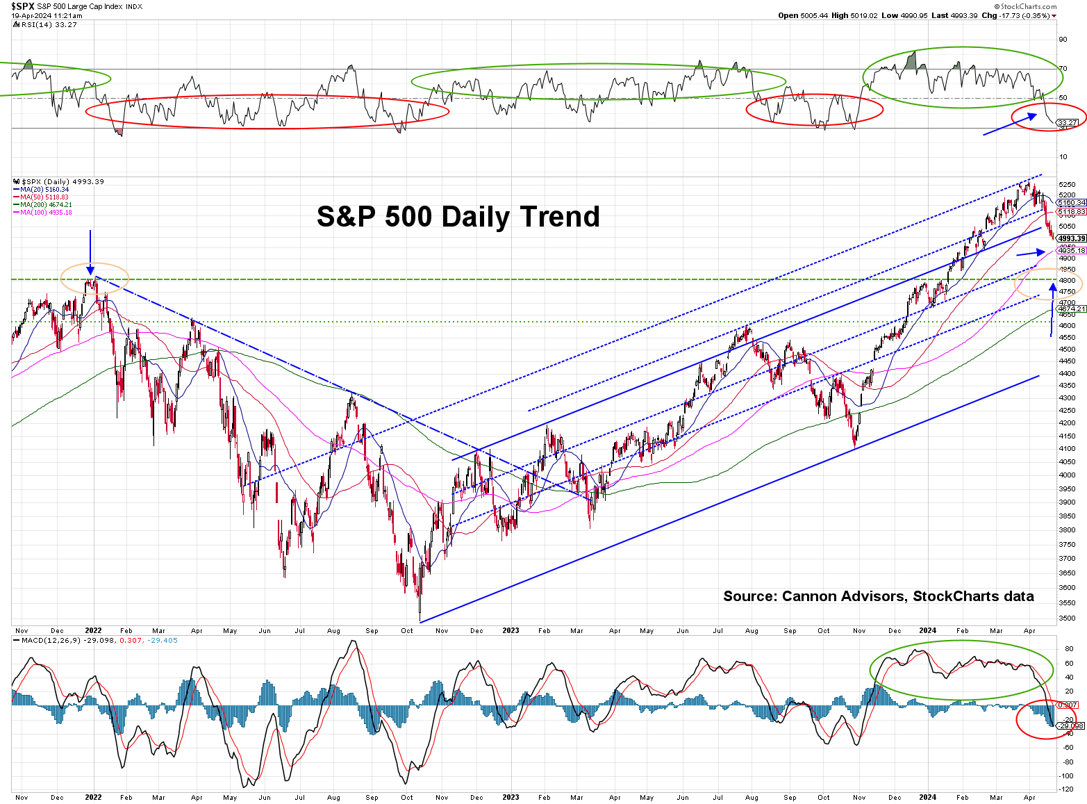 A very natural support level, which could attract investors back to the table, is the peak established from the prior high which was set at the beginning of 2022 (see green dotted line with the orange circle). My two "go-to" indicators are confirming that the market is indeed in a small pull-back for the time being. RSI has dropped below 50 (top chart), and MACD has just turned negative (bottom chart). This does not necessarily mean that the market will roll-over hard, but it does mean that the current environment requires caution. Our plan is to identify and pay close attention to the various support levels, such as prior peaks, moving averages, Fibonacci levels, and up-trend channel supports. For long-term investors, it pays to stay the course, as we are very much entrenched in a long-term uptrend; however for short or mid-term investors, some caution might not be a bad idea, at least until our indicators flip back to flashing green.