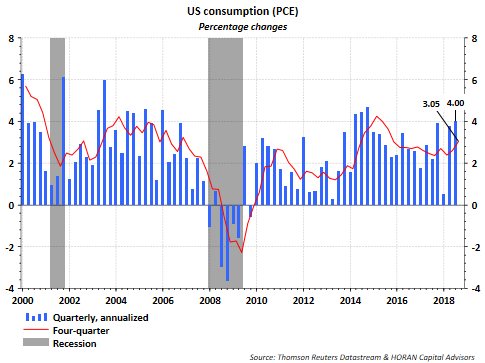 - U.S. consumer consumption continues to trend higher, running at a 4% annualized pace based on quarterly consumption reported in last Friday's advanced estimate of GDP. This is up from 3.05% in the second quarter. The consumer accounts for nearly 70% of economic growth and in and of itself, this is a positive input.