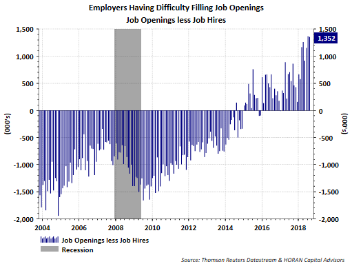 - Strength in the consumer is supported by a strong job market with job openings continuing to outpace job hires. Not shown is the fact job openings are up 18% on a year over year basis and exceed the number of individuals actually looking for jobs by nearly 1.2 million.