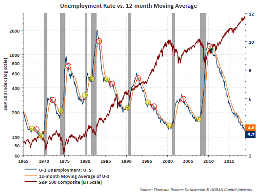 Tim's report summarizes our point of view pretty closely. As it relates to his unemployment comment, it is one reason our firm monitors the following chart and have written about this in the past. Economic turning points seem to occur when the reported unemployment rate crosses, from below, the 12-month moving average of that same rate. It is not the only variable to track, but one that is receiving attention at this point in the economic cycle.