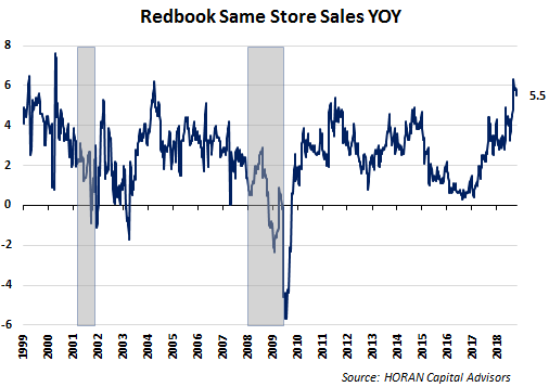 - Redbook reports weekly changes in same-store sales and last week the report shows same-store sales up 5.5% on a year over year basis. This now represents two consecutive weeks of a slowing pace in the same store sales results. However, Redbook notes the 5.5% growth rate remains one of the strongest in more than ten years. Recent strength in the performance of retail stocks provides some confirmation of this strong retail environment.