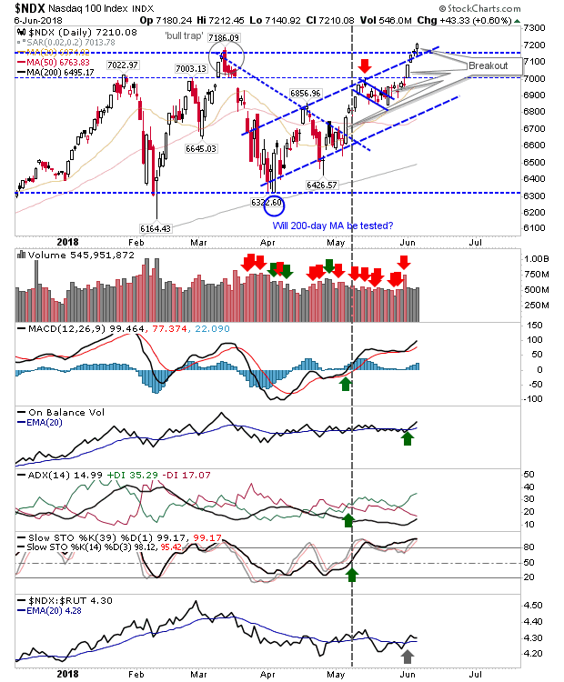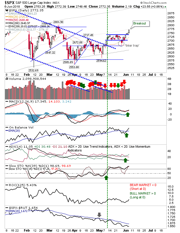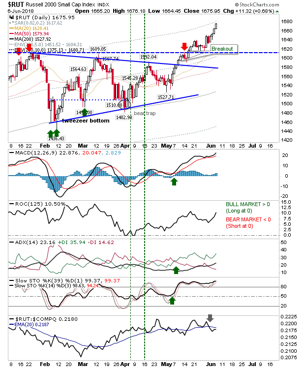 The Russell 2000 continued its run of good form. Those who traded the breakout have yet to be given an exit signal but near-term traders could look to take some profits.