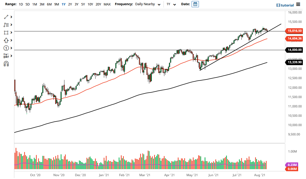 The 15,000 level is an area that offers a certain amount of support, especially as it is such a big figure that will attract a lot of attention. Furthermore, there is an uptrend line that is crossing through the 15,000 level, which I think will offer a certain amount of support in and of itself. That being said, as long as we can stay above this uptrend line, that is a good sign, but even if we do break down it does not necessarily mean that we are going to fall apart.