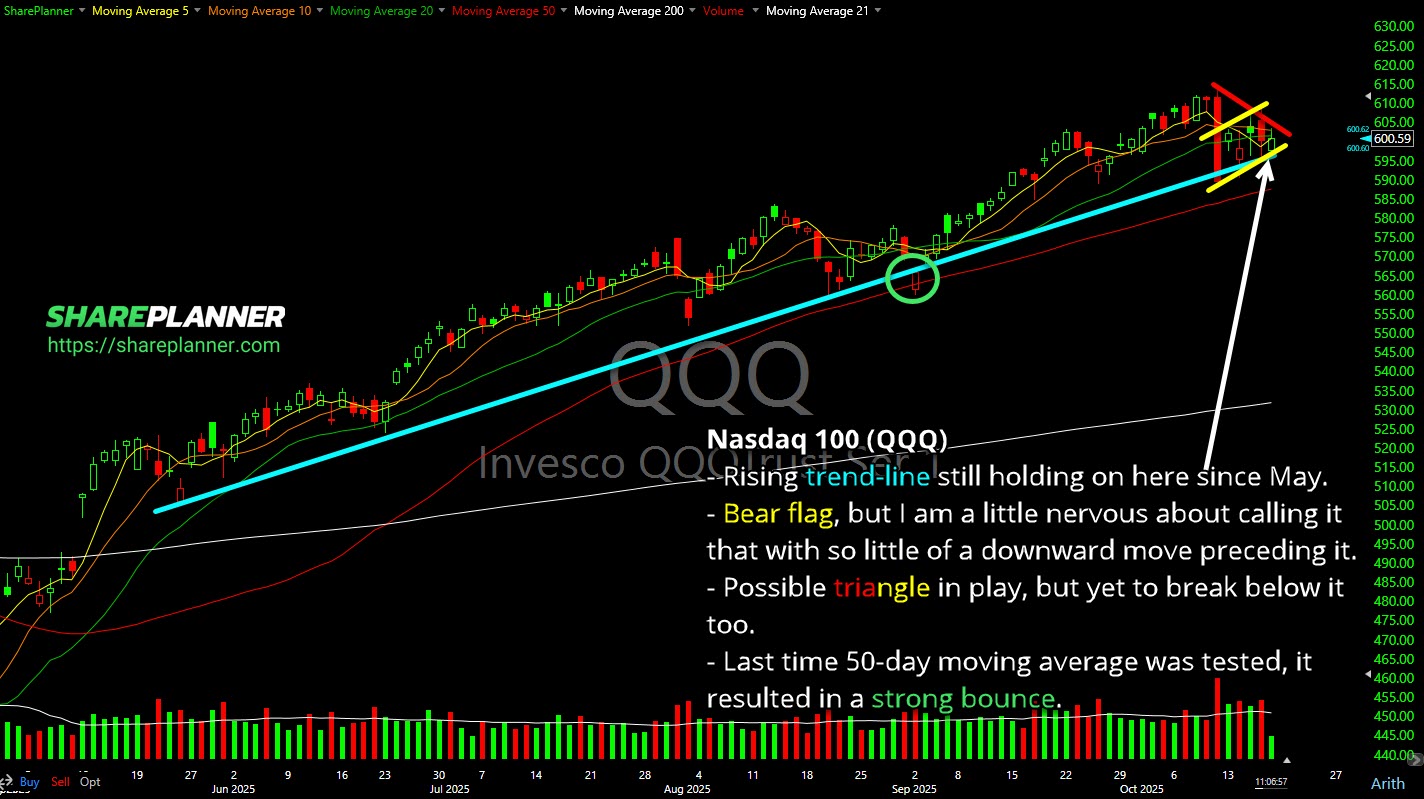 The Nasdaq 100 (QQQ) is still hanging tough despite some recent volatility. That rising trend line that’s been in place since May is continuing to hold up, and so far, buyers have stepped in every time it’s been tested.