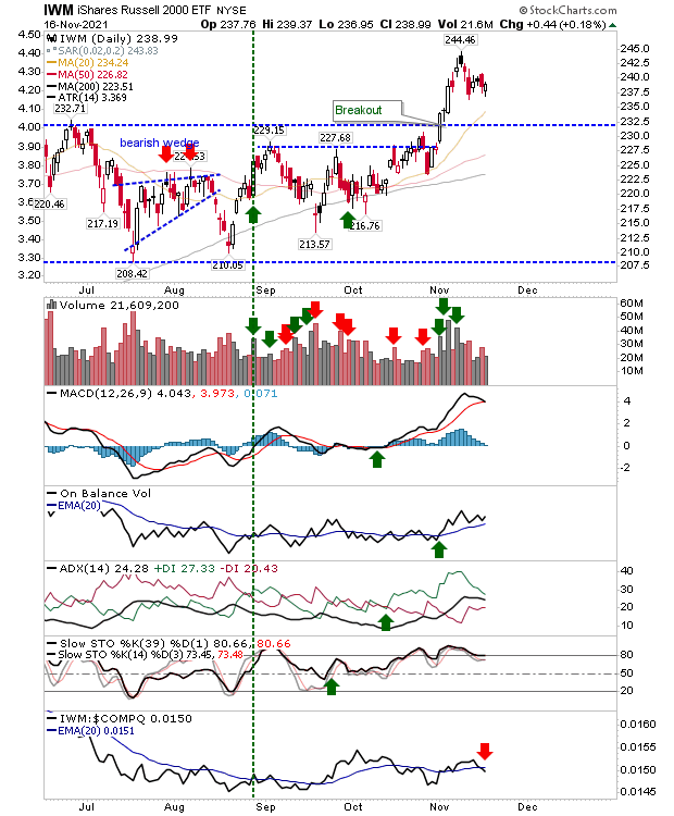 The S&P did manage an accumulation day as it too outperformed the Russell 2000. Aside from the MACD, all other technicals are positive. The extent of the pullback from highs - after a hefty run off 4,278 - is probably not enough to see the rally continue as it did before, so we may be looking at sideways action or more downside as traders continue to take profits off the run up. As it stands now, just below the last peak, it's in a bit of no-mans land.