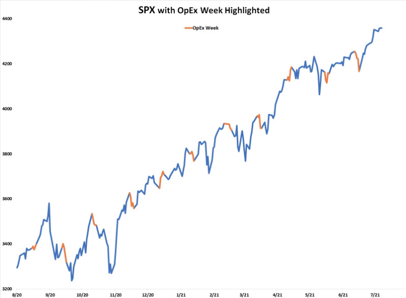 So here we are again, another down week for the S&P 500 for monthly Op/Ex. That would make 10 of the last 13 Op/Ex weeks with a negative S&P 500 return. Back in July, the Delta variant was headlined in the U.S., but highlighting the infections spreading throughout the United Kingdom and India. Issues related to jobless claims and rising inflation continued to litter the financial media landscape in July akin to the headlines this past week surrounding inflation, Delta infections, and Fed tapering. The wall of worry produced by the financial and social media is endless. Where price action is found unfavorable, the narratives are amplified and the average investor’s EQ is tested.