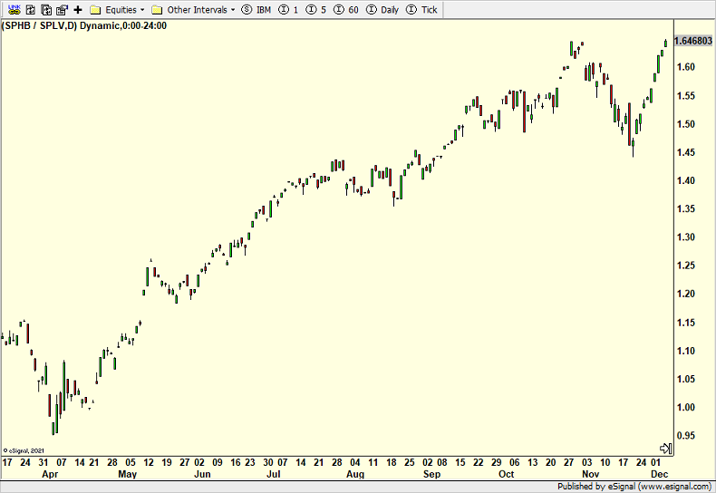 Next is a chart of high beta versus low beta which sounds wonky. In other words, it is the stocks with higher volatility and risk versus the lower ones. Since the tariff tantrum bottom in April, high beta stocks have clearly led which was one reason I stayed so steadfastly bullish all the way up. When some of our models turned in October and November, risk was still leading which is why I only thought a 5% pullback was likely. I was a bit surprised at how much the riskier stocks went down versus the lower risk ones. However, the past few weeks have seen a return to beta and higher volatility and riskier stocks which is healthy for the rally.