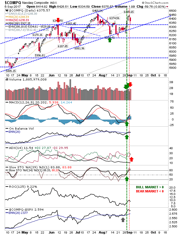 Friday's tight action plus a long weekend of North Korea news left traders skittish and wanting out. However, there wasn't a significant break of support to suggest a rout is imminent but further losses need to be watched.