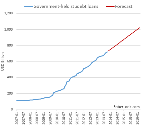 This is the time when everyone is making financial and economic forecasts for the upcoming year and beyond. Here is a simple forecast from Sober Look that did not require much analysis. By the end of 2014, student loan balances held by the federal government will exceed $850 billion and by the end of 2015 the number will be above a trillion. And this is on top of some half a trillion of loans that are not directly held but guaranteed by the federal government.