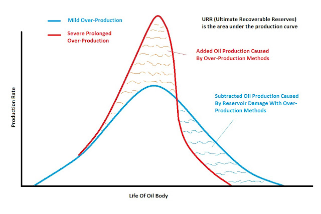The blue line is the kind of geologically sound curve Hubbert generated for the recovery of a large body of oil with just a little, maybe accidental over-production. The red line shows the effect of severe over-production and has the effect of steepening the climb on the upside, but also steepening the decline rate an even greater amount after the peak with a greatly damaged field.