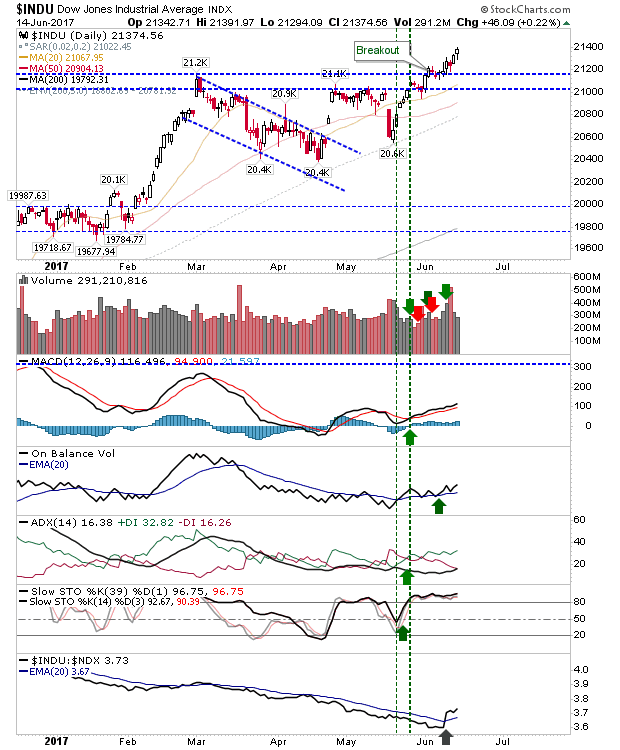 In contrast, the Dow Jones Industrial average added to prior gains. Momentum buyers will be pleased with its behavior.