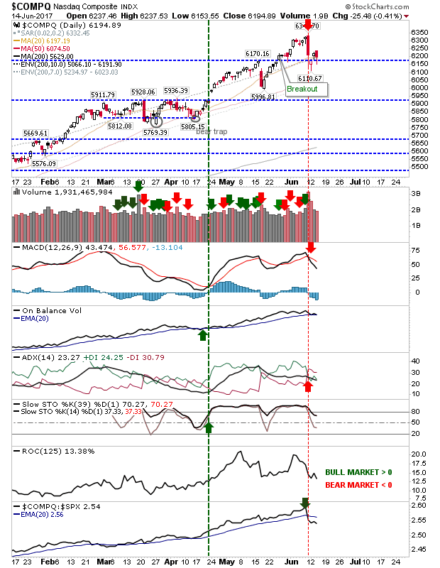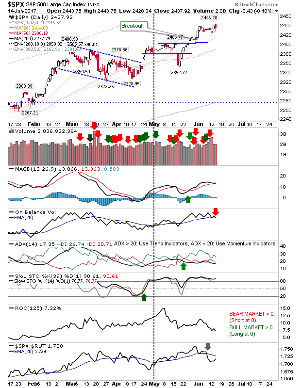 The S&P is more likely to shape a consolidation as other indices distract attention. Selling volume was light, but there was a 'sell' trigger in On-Balance-Volume. There is no clear topping behaviour for this index, so it's a wait-and-see for now.