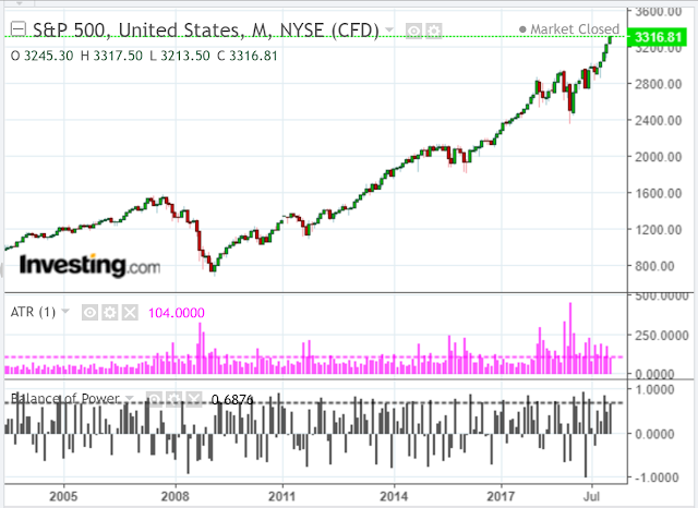 I've shown the input value on the Average True Range (ATR) as one period to show that, as of today, it's not registering at an extreme high reading on the monthly timeframe, suggesting that this rally has not begun to turn frothy and overbought, yet.